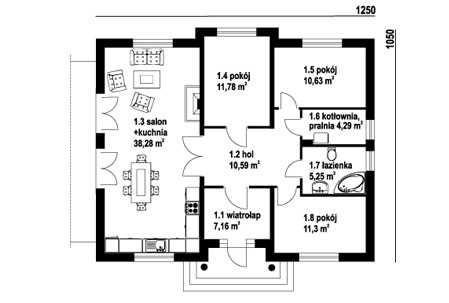 Budynek parterowy bez poddasza użytkowego. Aneks kuchenny w salonie. Kominek z możliwością odzysku ciepła.