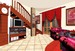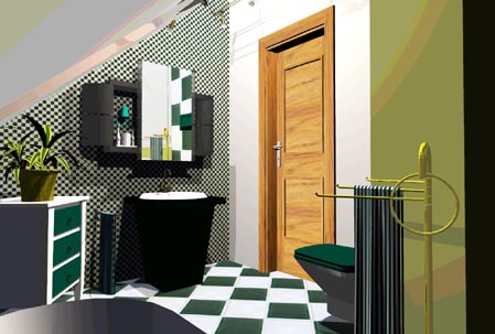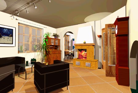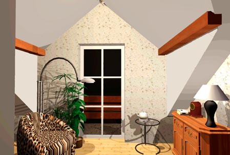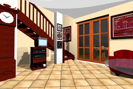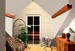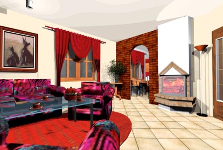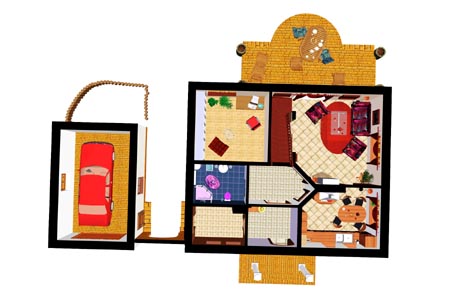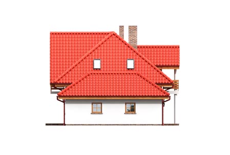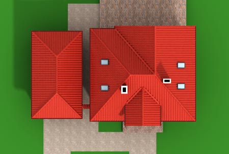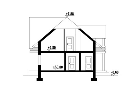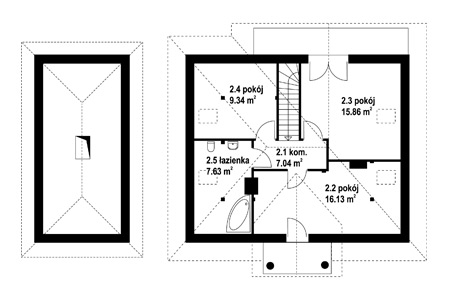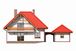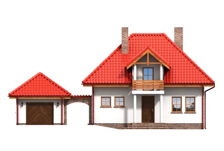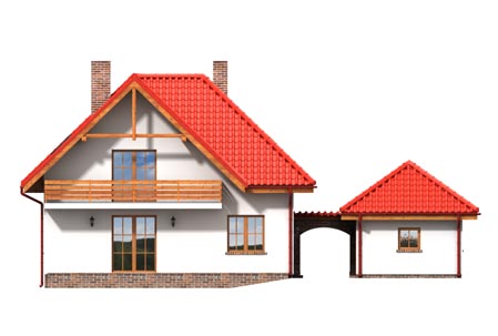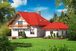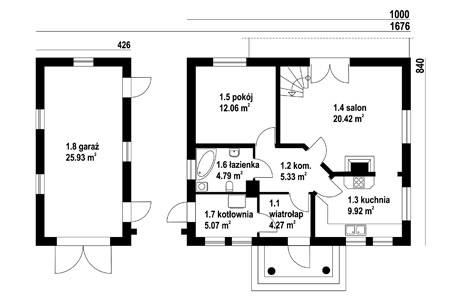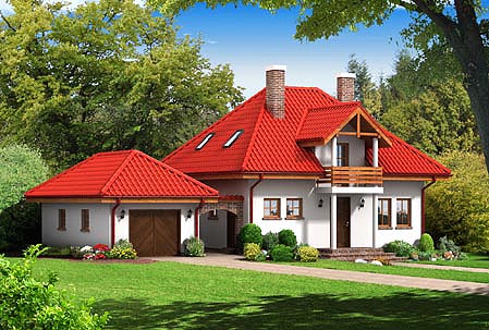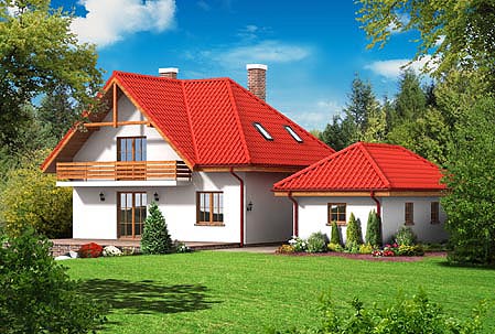 Dom z poddaszem użytkowym, garaż połączony z domem przewiązką. Schody na poddasze wychodzą z salonu.